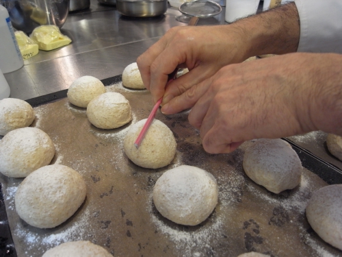 1時間醗酵させてオーブンに入れる前に粉をふり、カミソリで切れ目を入れます。